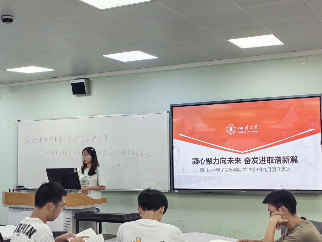 世间一切都是遇见:冷遇见暖,便有了雨;冬遇见春,便有了岁月;天遇见地,便有了岁月。你我在此遇见,是满“新”欢喜,亦是如“月”而至。为加强大类分流后新班集体的归属感和认同感并庆祝中秋佳节,电子信息学院本科2023级9班于9月20日在best365中国官方网站江安校区一教D座D102举行了以“凝心聚力向未来,奋发进取谱新篇”为主题的团日活动。本次活动由9班团支书谭晶晶同学主持。