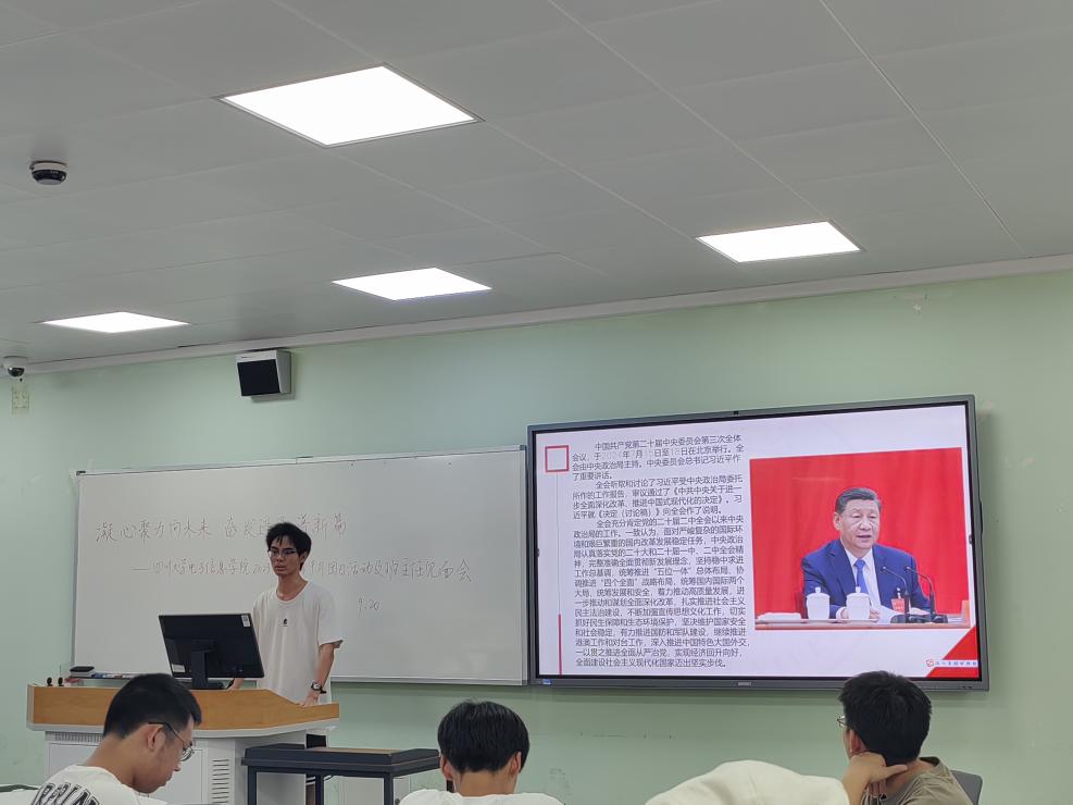 满“新”欢喜,新学期,与铿锵精神相遇。活动伊始,为深入学习贯彻党的二十届三中全会精神,团的十九届三中全会精神,引导广大学生感悟伟大成就、体悟党中央战略考量、沿着习近平总书记指引的方向奋进新征程,组织委员李仁翔同学带领同学们系统学习了党的第二十届三中全会精神。