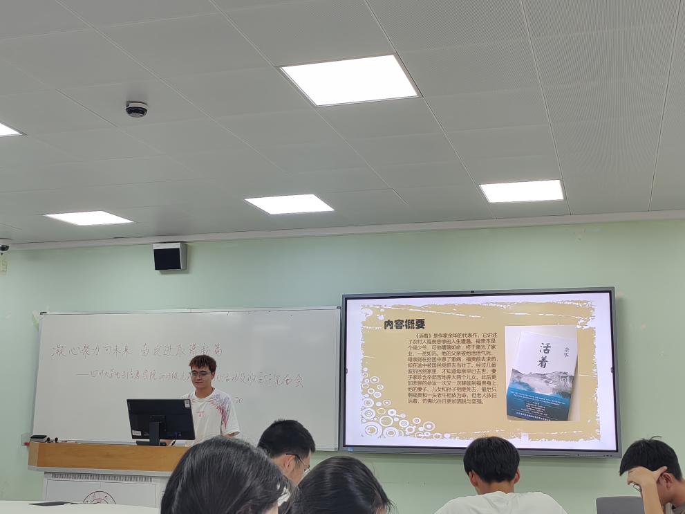 满“新”欢喜,新书籍,与深刻思想相遇。秋日美如斯,正是读书时,学习委员蒋熠铭同学分享了作家余华的代表作《活着》。同学们纷纷表示自己被书中传递的精神力量触动。