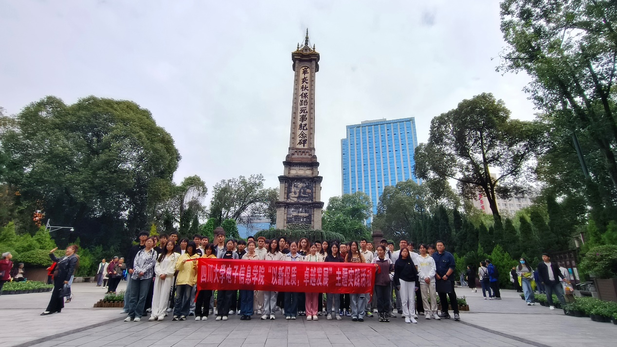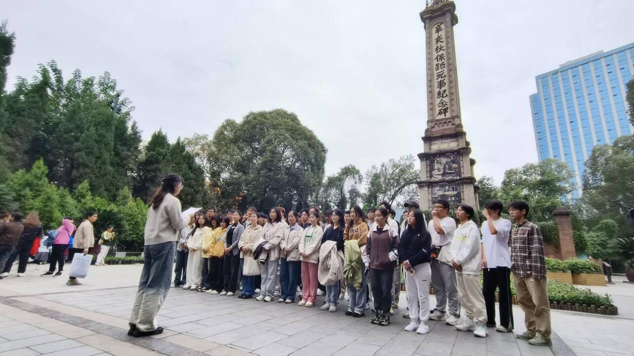 图为同学们在辛亥秋保路死事纪念碑下合影留念
