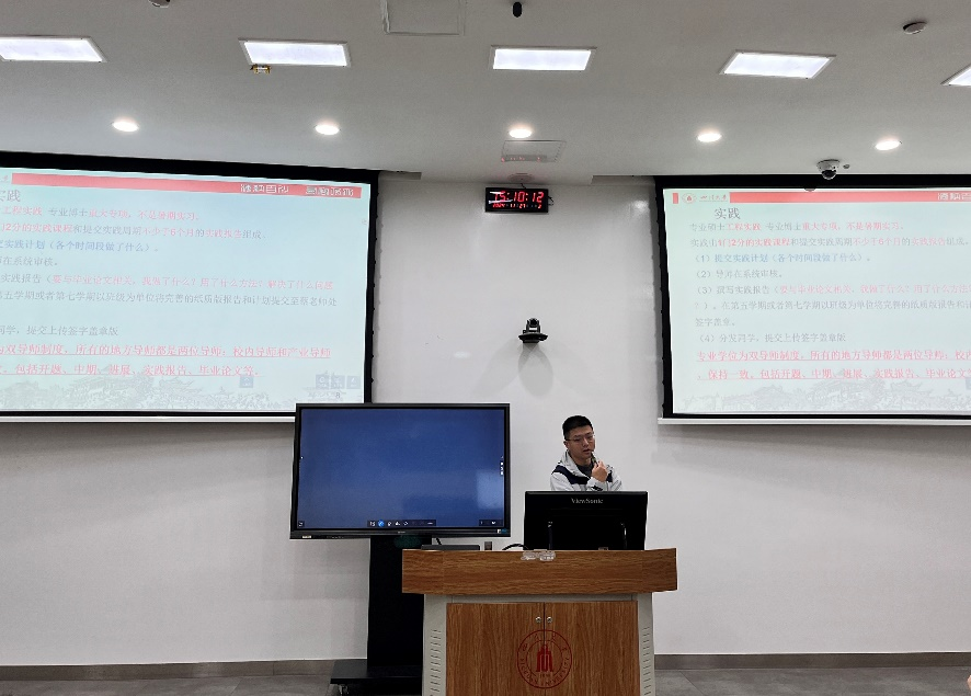 本次大会邀请了教务科蔡苹杨老师与年级辅导员何惠老师分别进行主题讲座。蔡老师主讲了中期开题报告及专业实践相关内容,深入分析了当前学术研究进度的关键点,并为同学们提供了宝贵的建议与指导。