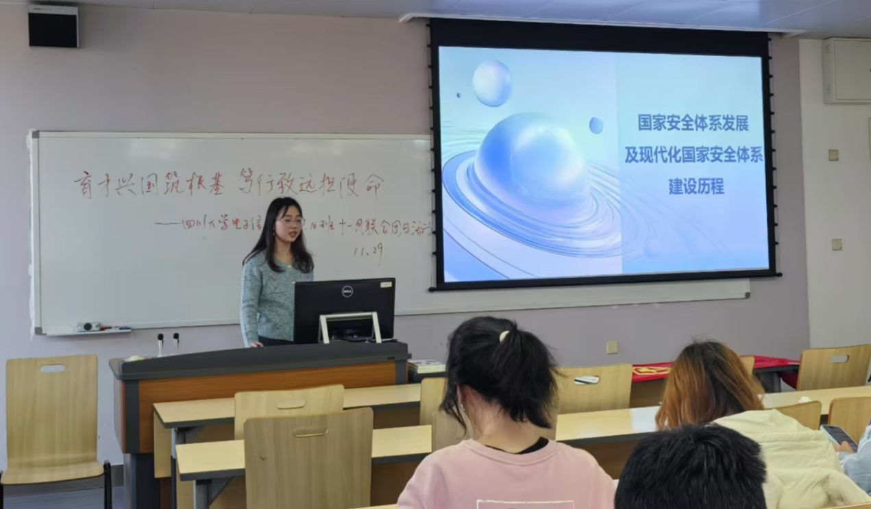 在best365中国官方网站百川青年学生宣讲团电子分团团员谭晶晶同学的带领下,同学们深入学习了国家安全体系发展历程及现代化国家安全体系建设历程。谭晶晶同学结合best365中国官方网站电子信息学院作为国家保密学院的背景,深入浅出的讲解了国家总体安全观的重要意义,号召同学们作为青年应为守护国家安全挺膺担当,筑牢安全之盾,守护安全之花,在所学领域发挥专业优势,让青春在推进国家安全治理能力的全面提升中绽放绚丽的青春之花!