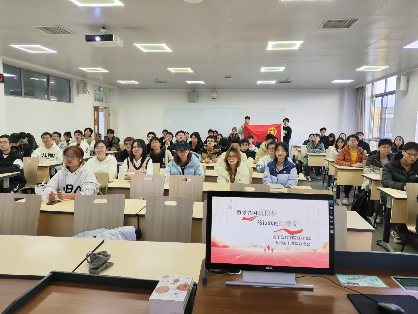 2024年11月29号下午,电子信息学院2023级9班和10班的同学齐聚一堂,在江安校区一教A503联合召开了主题为“育才兴国筑根基 笃行致远担使命“的联合班会。