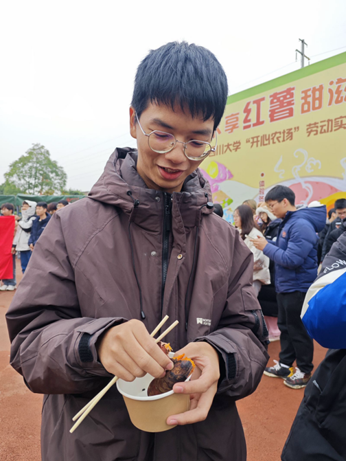 与此同时,开心农场的其他志愿者们也为大家准备了香气四溢的烤红薯,金黄的外皮下包裹着软糯香甜的薯肉,令人垂涎三尺。同学们在品尝的同时,也各自分享了本次劳动的感悟。谭晶晶同学分享道:“一分耕耘一分收获,在制作红薯粉的过程中,我深刻体会到了劳动的艰辛与乐趣,也更加明白了食物的来之不易。在今后的生活中,我将更加珍惜每一份劳动成果。”