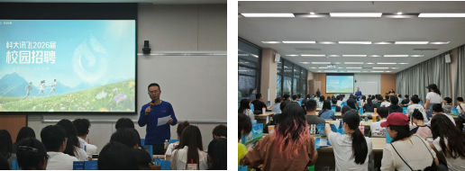 为助力学子精准规划职业生涯,活动特设校招咨询专区。科大讯飞校招团队详细介绍了2026届校招最新资讯。以生动的例子详细介绍了在科大讯飞能获得什么样的培养发展。提问环节,同学们就“AI发展前景” “跨专业求职”等问题踊跃提问,主讲人逐一解答,并开放了简历绿色通道。