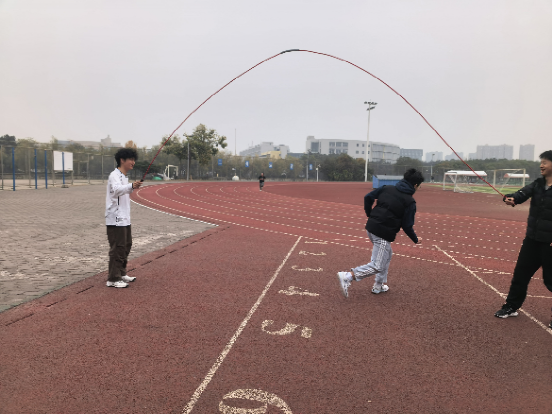 伴随着长绳击打地面的清脆声响,集体跳绳活动正式拉开帷幕。两名甩绳人员站姿稳健、发力均匀,长绳在他们手中上下翻飞,发出整齐划一落地声。参与活动的同学们依次弯腰蓄力、腾空起跳、转身落地,整套动作一气呵成。过程中,个别同学不慎绊绳,却毫不气馁,迅速调整状态重新投入活动,队友们则以掌声与呐喊声为其鼓劲助威,整个团队始终洋溢着昂扬向上的活力。