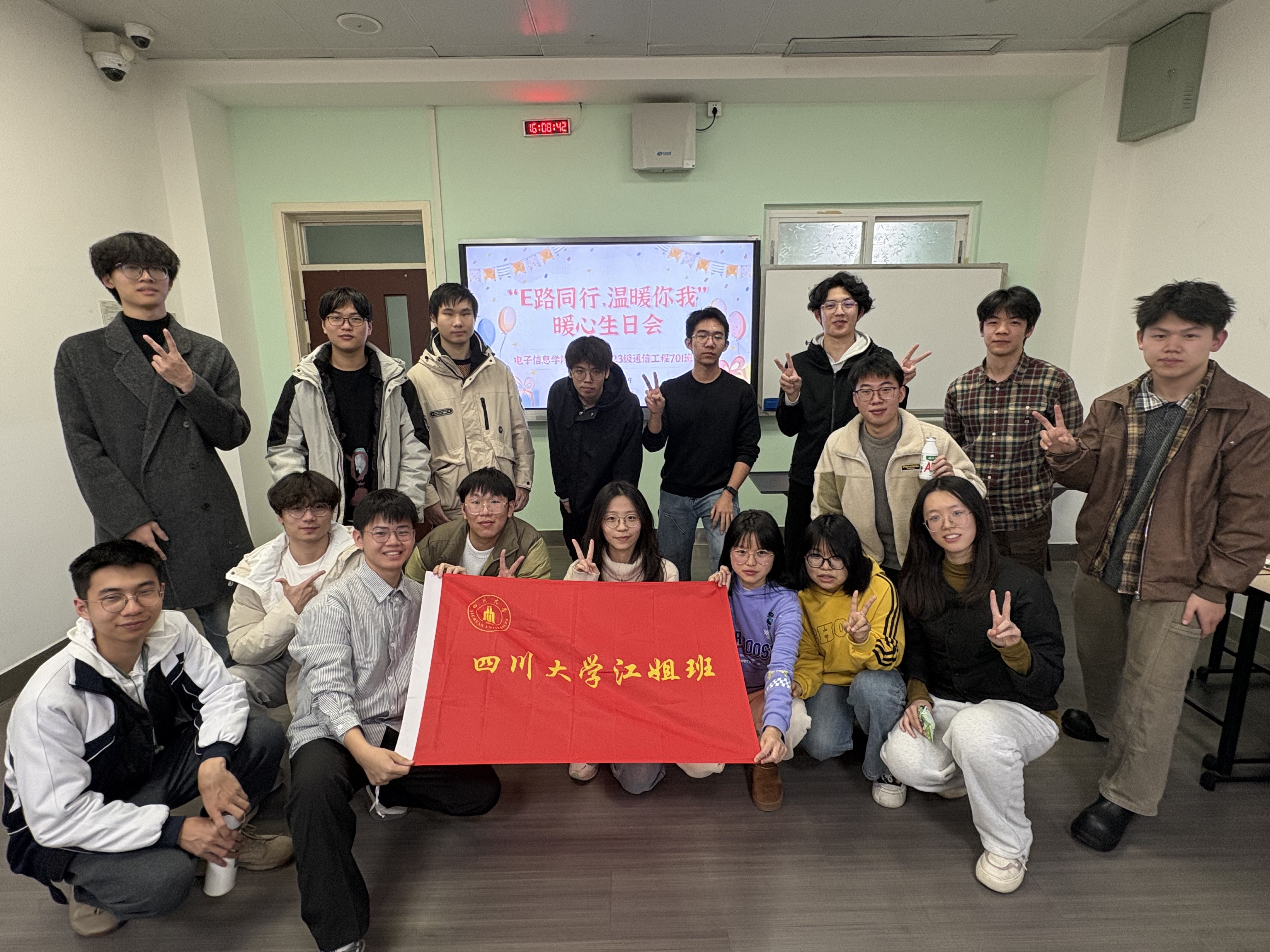 冬至将至,寒意渐浓,校园中却洋溢着别样的温暖。为凝聚班级合力,营造积极向上的集体氛围,12月19日下午,电子信息学院江姐班在望江校区基础教学楼A319举办“E路同行,温暖你我”集体生日会,为生日在11月、12月的6位同学共同庆生。班主任马守智老师与班级全体同学齐聚一堂,共度温馨时光。
