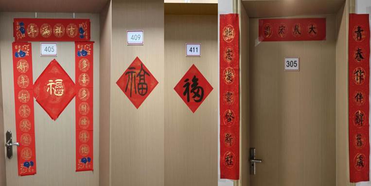 不少寝室还精心创作了寓意深远的春联作品,其中 “青春作伴辞旧岁,壮志凌云启新程” 一联广受好评。上联以 “青春” 为核,既彰显了学子风华正茂的朝气,也饱含对过往岁月的眷恋与沉淀;下联以 “壮志凌云” 绘志,展现了奔赴新征程的昂扬锐气;横批 “大展宏图” 收束全篇,将青春意气与奋进目标紧密相连,寓意以蓬勃朝气告别旧年,以鸿鹄之志开拓前路。另有 “扬鞭奋进、虎气满满,学业步步登高;财福皆至、遗憾清零,新年万事如意” 等佳作频出,字里行间满是对学业精进、生活顺遂的美好祈愿。