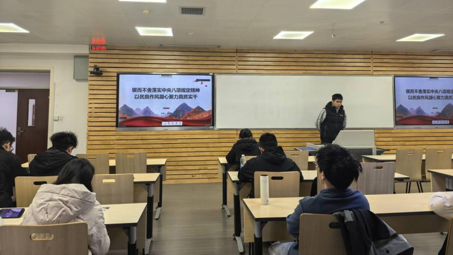 刘奕敏同学聚焦中央政治局民主生活会精神,就锲而不舍落实中央八项规定精神做了专题发言。她从时代背景、战略意义与实践要求等方面,系统阐述了八项规定的深刻内涵,强调党员应以“笃信、务实、担当、自律”不断锤炼党性,以真抓实干纠治“四风”,切实发挥表率作用,将制度优势转化为推动“十四五”圆满收官、“十五五”良好开局的强大动力,激励青年党员在推进中国式现代化的伟大实践中书写无愧于时代的青春篇章。