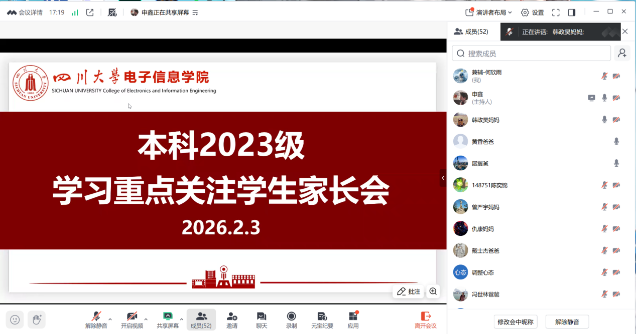 为加强家校联动,强化学生假期复习效果,2月3日晚,本科2023级辅导员申鑫老师主持召开了一次关于学习重点关注学生的线上家长会。50余位家长参与了此次家长会,进行了积极沟通交流。