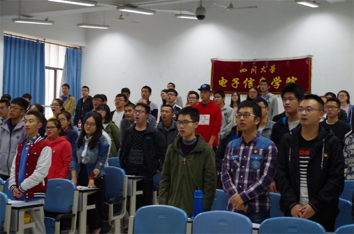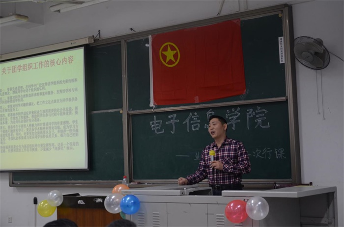 主持人宣布活动开始后,全体起立,庄严地合唱中国共青团团歌。接着,在同学们热烈的掌声中,电子信息学院党委陈笃海副书记以“结合实际,狠抓落实,全面推进团学工作”为主题,为同学们介绍了团学工作的核心内容,如何开展团学工作以及团学工作对于干部的成长等方面内容。陈笃海副书记讲解生动,举例翔实,内容丰富,深入浅出地将团学工作的重要性、开展团学工作的方法等重要问题一一为在座同学展开论述。最后陈书记以习近平总书记的一段话为结尾,表达了对新一届学生干部成长为合格的共产主义接班人的殷切期望。
