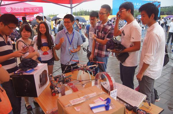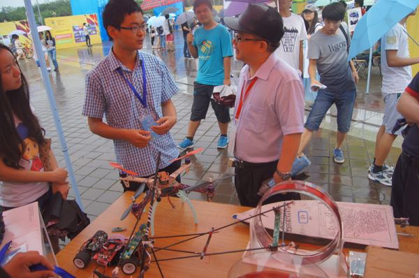 上午9点30分伴随着天空中飘下的小雨活动正式开始,在beatbox协会的同学精彩的表演过后。各学院、学术型社团纷纷将自己的展示作品置于展示桌上,由讲解员同学为参观同学、老师进行讲解。电子信息学院本次共有六件学生科技创新作品进行展示,可以自动调节飞行角度的四翼飞行器,自动寻道的飞思卡尔智能车吸引了许多同学老师前来观看。电子信息学院讲解员赖林同学,为前来观看的老师、同学们详细地介绍了这些电子产品的工作原理,设计想法以及未来可能的应用领域,并且为大家现场演示了其中一些作品。前来观看的老师对我院学生的设计作品给予了很高的评价,并鼓励同学们继续努力,设计出更多可以投放到市场当中的电子产品。活动于中午12点正式结束。