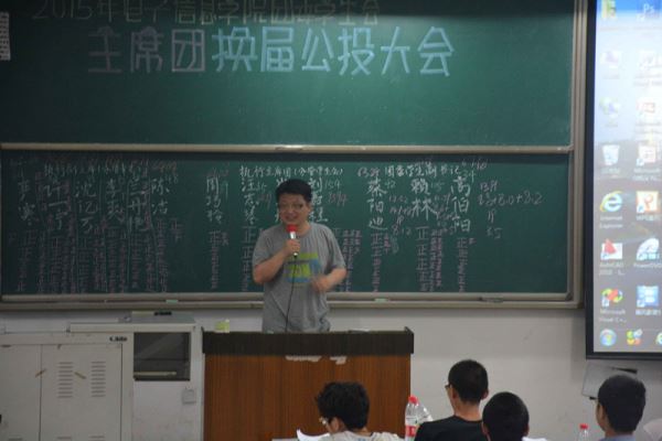 2015年5月24日下午3:30,,电子信息学院团委学生会2015年主席团换届选举在江安校区综c107教室圆满进行。参加本次换届选举的学院老师有电子信息学院团委书记李运国老师,2013级辅导员孟滋常老师,2014级辅导员吴秀玲老师、陈林老师。此外,望江校区团委学生会主席团以及江安校区团委学生会主席团也到场参加了本次活动。