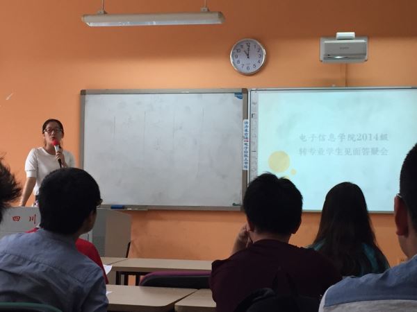 2015年5月24日上午11:00于综合楼B座110教室电子信息学院召开2014级转专业转入新生见面会。电子信息学院2014级辅导员吴秀玲老师出席并主持本次见面会,28名新生以及六名现任班委参加本次见面会。
