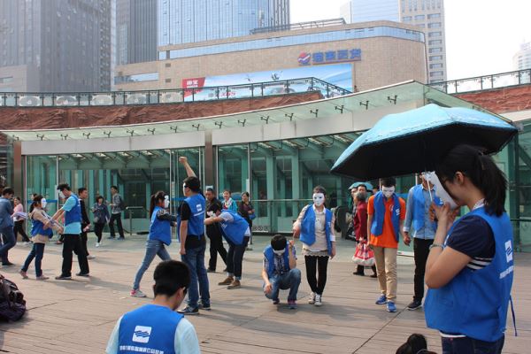 4月1日早上8点10分,16名志愿者乘车到达环球中心进行活动准备。在和相关工作人员商量好场地事宜后,8点50分哨声响起,志愿者穿上蓝色马甲,带上面具,以吹哨人为基准排好队形,瞬间定格成塑像姿势静止不动。两分钟后,哨声再次响起,志愿者拉开准备好的横幅,齐声喊口号—“关爱自闭症,我们在行动”。结束后散开到指定地点集合。9点20分乘坐地铁前往天府广场,10点整定格快闪三分钟,结束后乘二号线到春熙路。11点整在春熙路的定格快闪迎来了很多路人的围观,在相关安保人员的协助下,顺利地完成了最后一个地点的快闪。随后,志愿者们有序地离开,乘车返回学校。