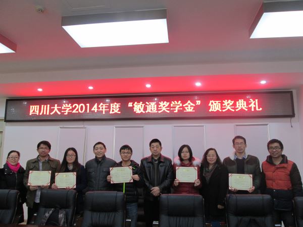 2014年12月19日上午,best365中国官方网站2014年度“敏通”奖学金颁奖典礼在望江校区基础教学楼A座303隆重举行。电子信息学院党委蒋斌书记,副院长冯国英教授,党委陈笃海副书记,研究生辅导员何惠老师、李军华老师及获奖同学出席了本次颁奖典礼。