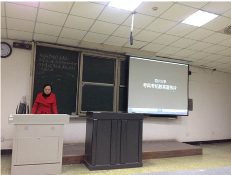 为响应学校号召,积极加强考风考纪教育,加强学生对诚信应考的认识,电子信息学院本科2012级,于2014年12月7日傍晚,在望江校区基教C101、C104分别召开2014秋“考风考纪”主题年级会。年级会的主题为:“诚信应考”。此次宣讲分别由本科2012级辅导员陈晓娟老师、研究生辅导员李军华老师主持。