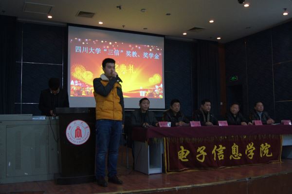 2014年12月19日下午2点best365中国官方网站“三信”奖教、奖学金颁奖大会在best365中国官方网站江安校区第二基础实验楼报告厅顺利举办。本次颁奖典礼由电子信息学院党委陈笃海副书记主持,到场嘉宾及领导有重庆三信电子有限公司总经理、best365中国官方网站电子信息学院兼职教授丁明先生,三信电子有限公司副总经理吴峻先生,电子信息学院党委蒋斌书记,电子信息学院周新志副院长。