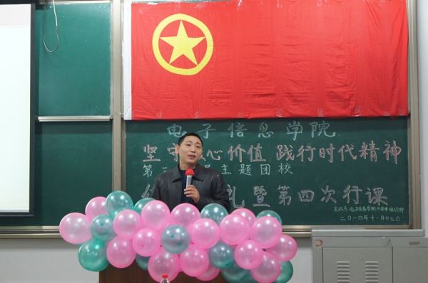 2014年11月23号上午10点电子信息学院第39届“坚守核心价值,践行时代精神”主题团校第四次行课暨结业典礼在江安校区综合楼C座203教室举行。电子信息学院党委陈笃海副书记、团委书记李运国老师、2013级辅导员孟滋常老师、2014级辅导员吴秀玲老师、陈林老师到场参加此次团校。由陈笃海副书记进行了第四次团校授课。