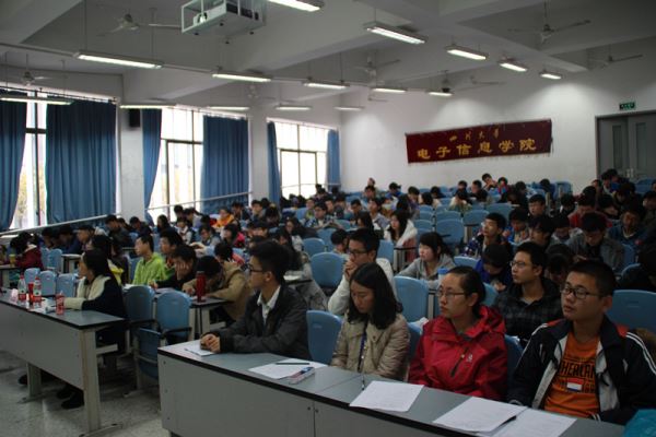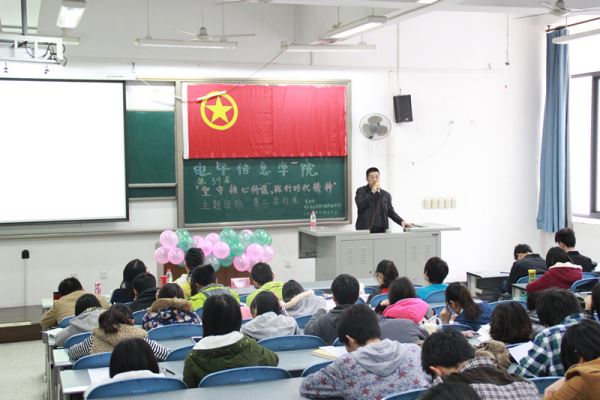 2014年11月16号上午9点30电子信息学院第39届“坚守核心价值,践行时代精神”主题团校第二次行课在江安综C103教室顺利开课。本次团课由2014级辅导员吴秀玲老师主持,电子信息学院党委蒋斌书记主讲。