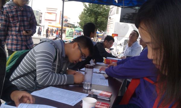下午2:00分,电子信息学院“腾飞”青志服务队的队员们在华联超市门口集合,人员到齐后进行了简单的分工。到了青春广场旁指定服务点后又进行了简单的培训,并换上志愿者服装迅速投入到了工作中。志愿者们分别进行着宣传、填表、服务的工作。工作的内容主要包括:对过往的同学进行无偿献血的宣传;指导有意愿献血的同学填表、体检;向献血者分发水、牛奶和礼品以及铺助护士们贴表、填献血证等。工作有条不紊地进行着。活动过程中,有同学询问无偿献血及盖章的有关事项,志愿者向他们进行了耐心地讲解。下午4:00分,在对下一批志愿者进行了培训指导后志愿者合影留念,工作顺利完成。