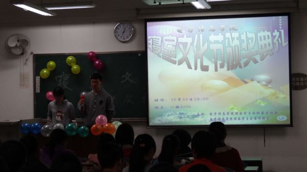 2014级电子信息学院寝室文化节颁奖典礼于2014年10月24日晚19点在江安一教A220教室顺利举行,电子信息学院团委主席耿子乔、副主席潘岳镭,商学院权益部部长刘欢欢,基础医学和法医学院权益部部长刘筱璠参与了此次活动。
