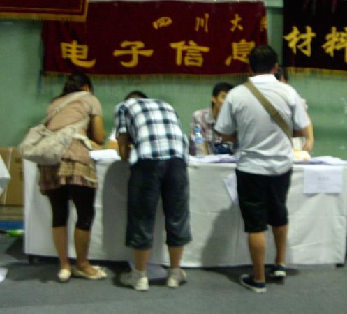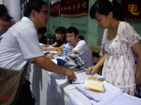 9月1日早上8:00,电子信息学院2011级研究生新生入学报到工作正式拉开帷幕。在望江体育馆风雨操场的一角,电子信息院研究生会工作人员仔细核对前来报到新生的录取通知书,指导新生进行签到、登记,然后发放新生入学手续传递单、新生入学指南以及研究生会招新表,并根据新生特殊情况发放培养费缓交申请表、新生不在学校住宿承诺书。告知新生入学报到注意事项,待新生完成全部的入学手续之后,验收新生入学手续传递单,并回收研究生会招新表。