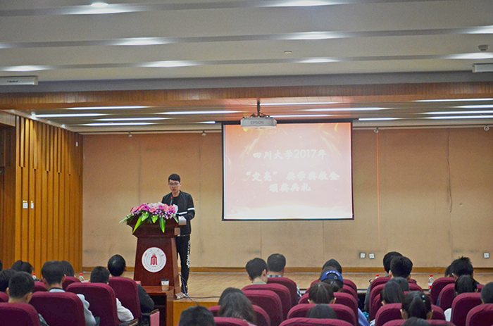 正式颁奖前,主持人陈笃海副书记首先带领大家清唱了国歌,全场气氛庄重。紧接着,他向在场的各位来宾介绍了本次颁奖典礼流程,让在场老师及同学对这次颁奖典礼有了更全面的认识。在接下来的颁奖环节中,伴随着激昂的音乐声,在场嘉宾为获奖者颁奖,获奖者手持奖状,和嘉宾一同合影留念。本次获奖的老师和同学均为电子信息学院优秀楷模。在颁奖之后,获奖的老师和同学都派出了代表上台发言,发言的主要内容是感谢各系辅导员,学校领导的关怀和教育,并且还表达了对今后工作不断完善,积极进取的态度。在颁奖典礼的最后,陈笃海副书记向大家介绍了“定亮”奖的由来。“定亮”奖是由一位往届毕业的优秀学生创立的,他背后的求学、创业故事,深深感动和激励着电子信息学院的学子。