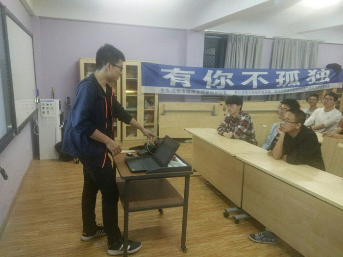 在演讲结束之后,志愿者们便开始带领同学们进行活动的第二个部分:“打开心锁”卡牌游戏。志愿者们首先给同学们讲解了游戏规则,之后在确保同学明白了游戏规则的前提下向同学们分发卡片,开始游戏。在游戏过程中,志愿者会不时的指导同学们,同时也不断向同学们渗透关于自闭症的知识。同学们在每轮游戏的发言中也都直接或间接的表达着对于自闭症患者的祝福或关心。在活动结束后,志愿者也引导同学们在今后生活中更加关心自闭症,并留下了合影留念。