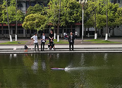 上午短暂的时光匆匆而过,迎来的将是下午激烈的角逐。下午2:00,比赛正式开始。一声哨响,第一只船出发了。在选手小心谨慎的操控下,船或者加速前行,或者减速拐弯,途中还要绕过四个浮标。评分人员根据船完成比赛所用时间,中途碰撞、超出区域的次数进行打分。紧接着,按照排序,一只只船开始了自己的航行。在这场激烈的比赛中,一些船脱颖而出,不仅美观个性,而且参赛中加速减速,流畅顺利,浮标岸壁,一次未碰,赢得大家一致称赞,拍手叫好。一些船,虽然在中途有一些小碰撞,但在小心操控下,也顺利地完成了比赛。当然,也有一些突发状况。一些船体在参赛前出现了故障,需要临时修改,便不得不延迟参赛;一些船在参赛中意外沉水,或者静止不动,同学们便及时帮忙打捞;而有的船因为马力过大,不受控制,冲向岸边。面对这些突发状况,同学们虽然显得有些焦急,但也在有条不紊的改进着自己的船,高效地解决问题,重新参赛。就这样,不知不觉,比赛进入尾声。