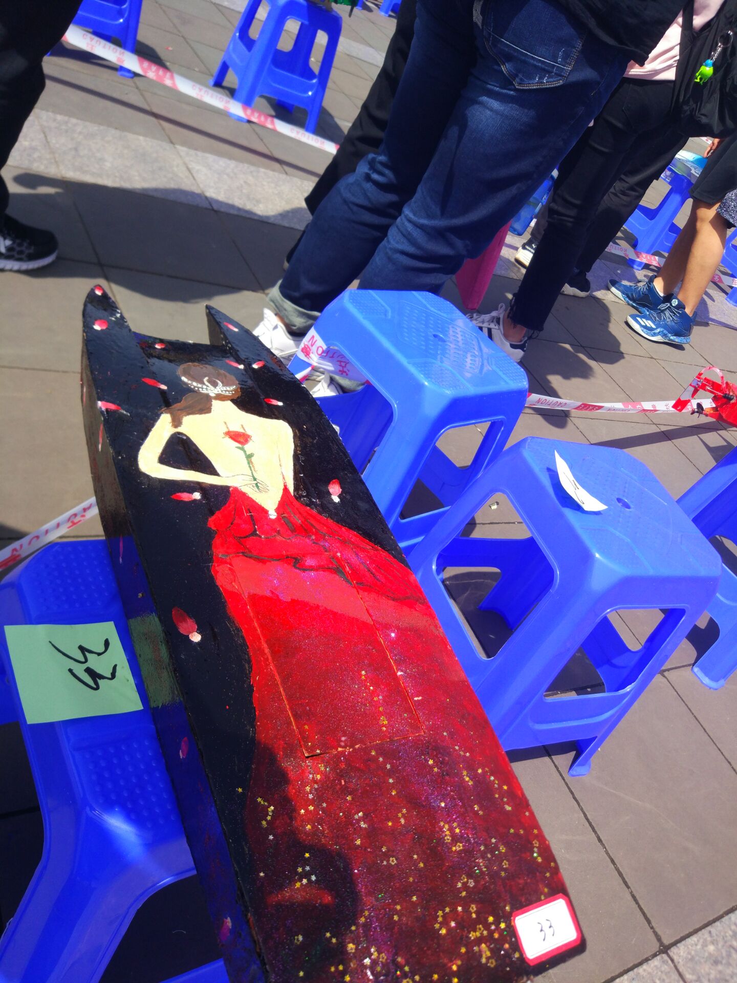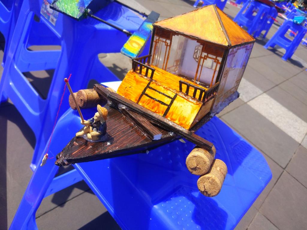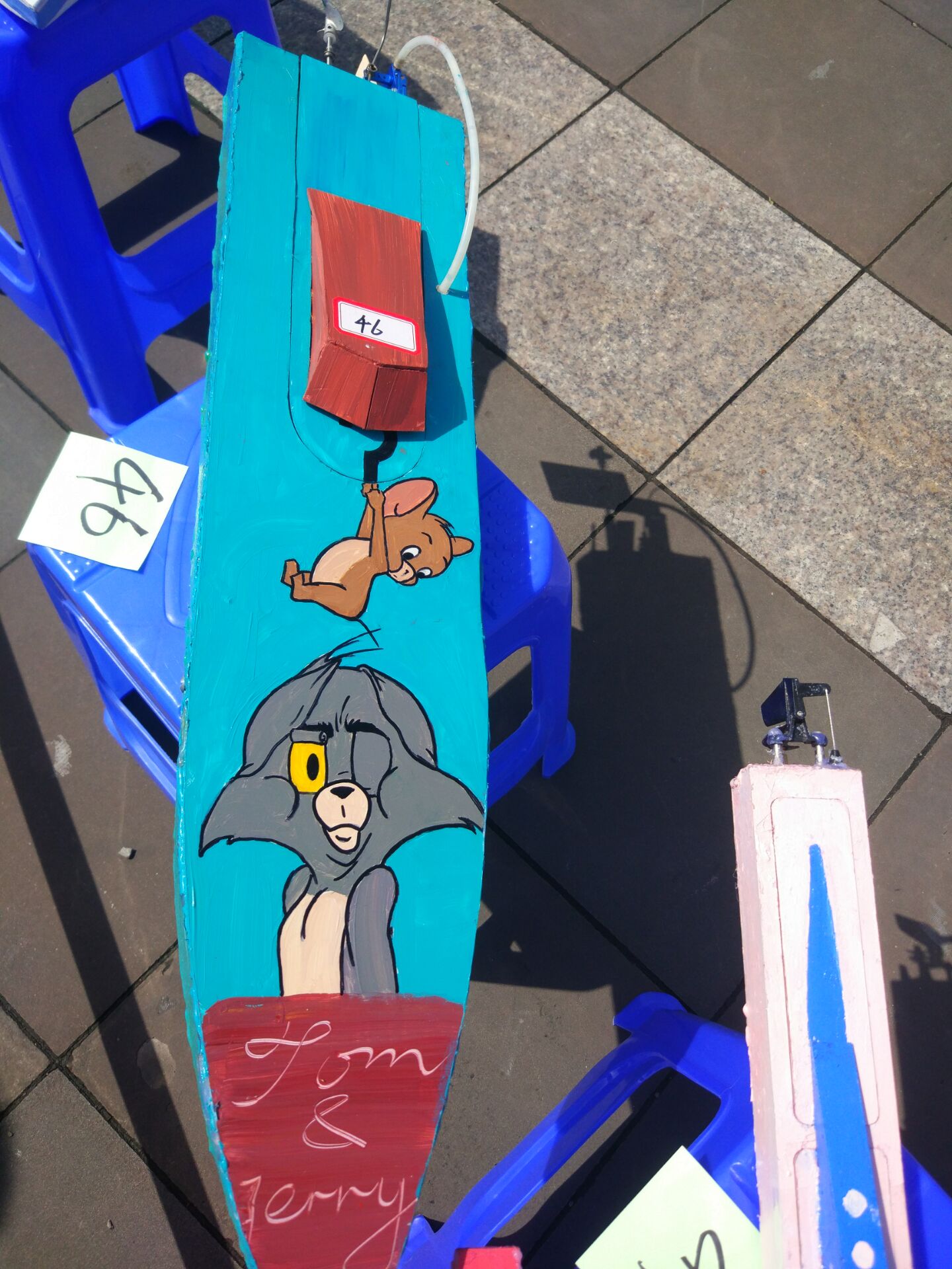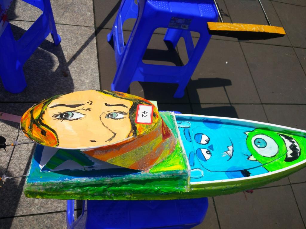 4月1日清晨,天刚蒙蒙亮,干事们便积极地开始了准备工作,在大家齐心协力下,7:30左右便已将凳子摆好成“w”型,并依次给凳子贴好船号的标签。8:30左右,参赛队员们陆陆续续的到场,将自己队的船体小心翼翼地放到相对应的凳子上。一眼望去,有体型较大的,也有小巧玲珑的;有赛车形状的,也有风筝样的;有老虎花纹的,也有海波浪花的…真是眼花缭乱啊!评委们根据船体的结构,创新、美观和环保程度对船只的外形进行打分。过往的同学也纷纷投来欣喜的眼光,在欣赏过各式各样的船体后,小伙伴们对自己最爱的船模投出一票。一些参赛队员们会向同学精彩地讲解自己船体的独特之处,希望可以拉到这宝贵的一票。