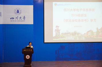 2018年9月14日下午2点,电子信息学院2017级新生学习依法治校宣讲会在best365中国官方网站江安校区水上报告厅举行。参加宣讲会的有电子信息学院2017、2018级辅导员陈林老师、2018级兼职辅导员李钰凤老师以及电子信息学院2018级全体新生。