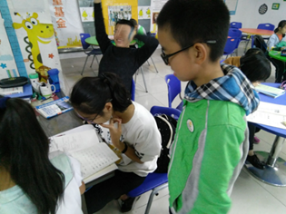 三名来自电子信息学院的志愿者从江安校区出发,骑车到达新街社区学生活动室。志愿者们以大哥哥大姐姐的姿态走进活动室,推门可见活动室的装饰妙趣横生,每一个书架,每一张贴画,都表现出了孩子们的纯真和小学生活的快乐。志愿者们和老师进行了简单问候之后,未等坐下,便有孩子拿着课本,礼貌地请求志愿者为其听写字词。(图1)中志愿者为小朋友听写,气氛和谐温馨。孩子们写完作业之后,陆续将自己的作业拿给志愿者们检查。(图2)中的姐姐在耐心批改作业并为小同学详细讲解。小朋友们写作业的时候,志愿者们就在活动室里轻轻走动,观察小朋友们的习题过程,并随时为小朋友们解答问题。在志愿者的讲解之后,小朋友都恍然大悟,露出欣喜的笑容。在和谐快乐的氛围之中,时间悄悄溜走,此次志愿活动在志愿者和小朋友的依依不舍中圆满结束。