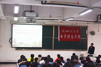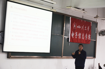 为深入传达十九大精神,使同学们了解当下国家的形势与政策,体会肩负的时代重任,2018年12月14日下午一点五十分,电子信息学院党委邰明松书记在江安校区综合楼C206教室为电子信息学院2018级本科部分同学带来了一堂意义深远的主题党课。
