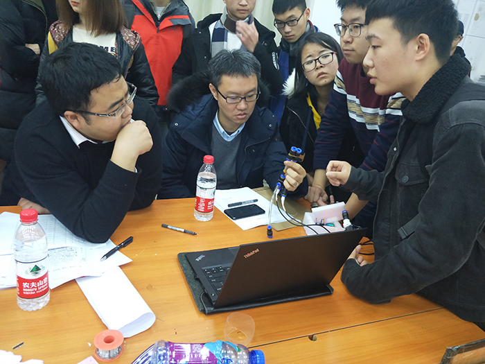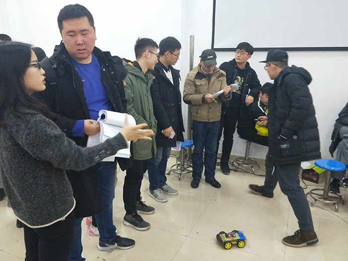 13:00,比赛正式开始。比赛分为作品调试、答辩测试两个阶段。首先进入的是第一阶段——作品调试阶段,各组选手进行作品调试与细节局部优化,确保参赛作品达到最佳状态以进行下一阶段的正式测试。在接下来的答辩与测试阶段,参赛者被分成七个组别,分别对应着各自的参赛课题,有序地进行作品答辩和测试,期间,评委老师们会对作品进行了详细的点评,并依据选手的测试答辩情况与作品整体效果进行评选打分