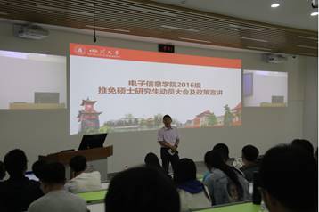 2019年9月11日上午9点,电子信息学院2016级本科推免研究生动员大会在best365中国官方网站望江校区基础教学楼C座201举行。参加本次推免研究生动员大会的有电子信息学院主管本科教学的雷印杰副教授,主管学生工作的党委陈笃海副书记,2016级辅导员陈晓娟老师,以及所有拟参加研究生推免的2016级优秀本科生。
