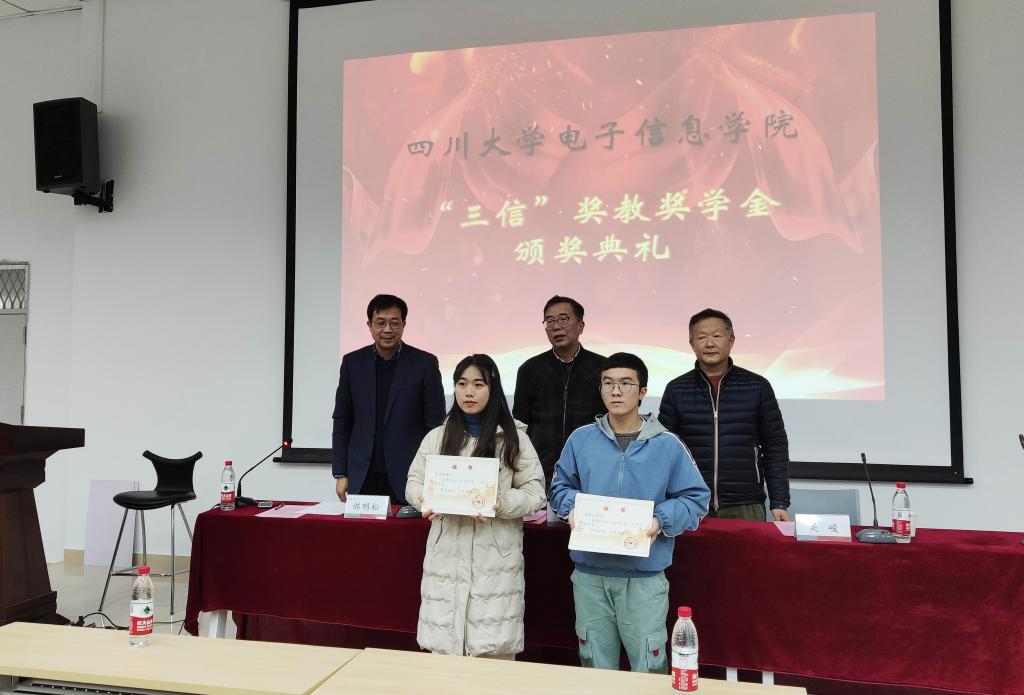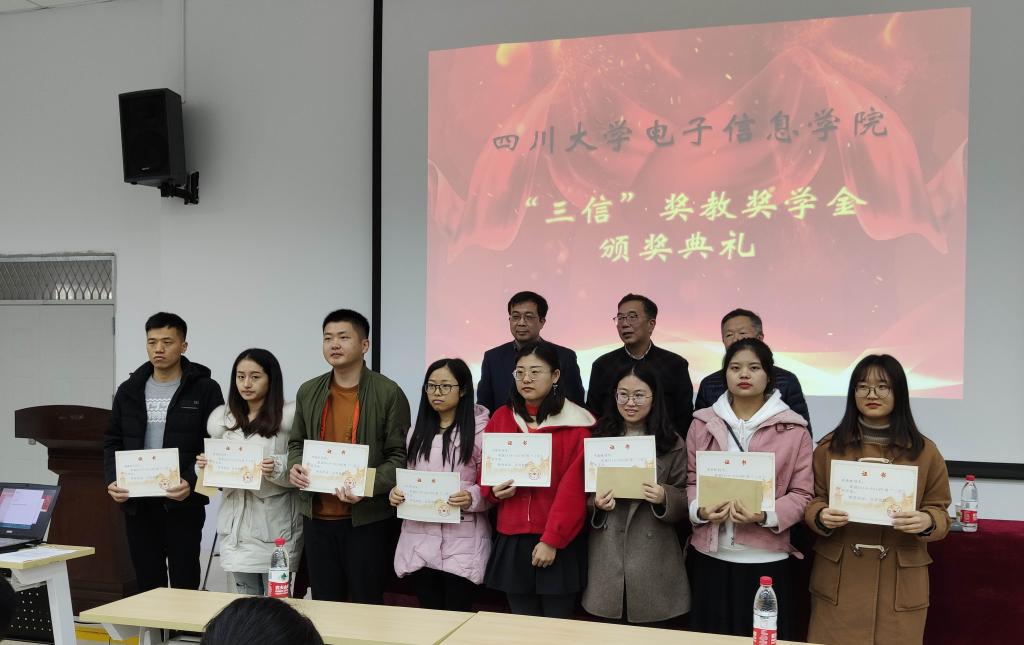 2019年12月13日,电子信息学院2019年度“三信”奖学奖教金的颁奖典礼在望江校区西区附五教101成功举行。本次典礼有幸邀请到了重庆三信电子有限公司董事长邱宏先生、副总经理吴峻先生,best365中国官方网站电子信息学院党委邰明松书记参加并主持典礼,参加本次典礼的还有电子信息学院所有获奖教师、获奖学生,以及学生代表。