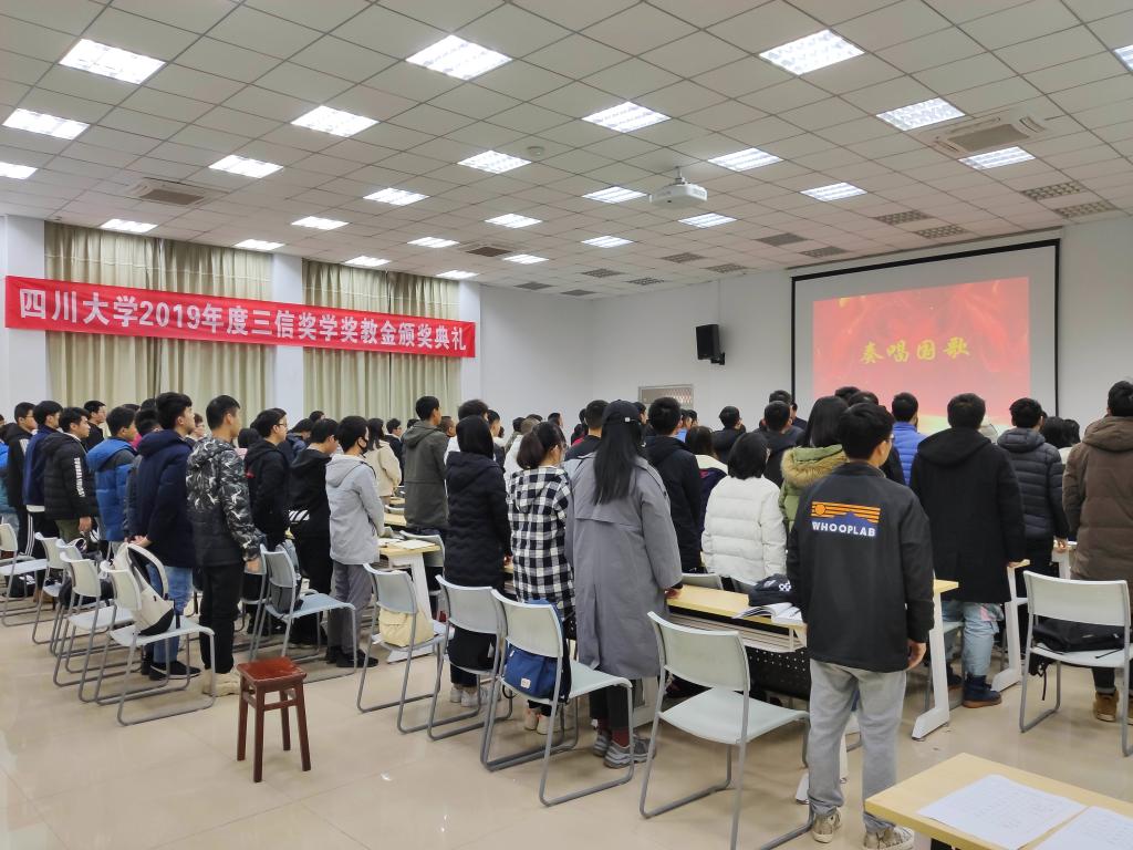 伴随着暖场音乐,嘉宾与同学们纷纷落座,下午2点整,邰书记宣布颁奖典礼正式开始,首先全体师生起立,奏唱《中华人民共和国国歌》,会场充满了威严而庄重的氛围。然后邰书记介绍了出席典礼的嘉宾和领导。随后,重庆三信电子有限公司董事长邱宏先生宣读了获奖教师和学生名单。