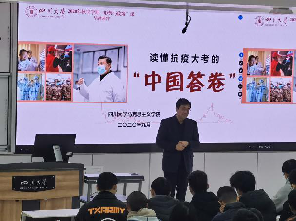 课程开始前,邰明松以一段有趣的视频开场,主要讲述的是美国在疫情大面积爆发后,指责中国政府抗疫不力的无理行为,并以此引入了第一部分内容:中国抗击疫情的艰辛历程。他从疫情初期中国政府迅速应对突发疫情到中国的抗疫成果初步取得成效,再到取得疫情保卫站的决定性成果,为同学们详细地介绍了疫情期间,中国的艰辛抗疫历程、采取的各项措施及获得的巨大成功。之后,邰明松又以一段视频对比了中国和美国面对疫情的不同态度及两国不同的抗疫结果,进一步证明中国的抗疫举措是成功的。在第二部分内容中,邰明松讲述了习近平总书记的“战疫日记”,并强调道以总书记为核心的中国共产党为全中国人民交了一份满意的答卷。随后,邰明松在第三部分内容中讲到,在中国共产党的坚强领导下,全中国人民激发出众志成城,抗击疫情的决心,最终确保了全党、全社会能做到上下一条心、劲往一处使。课程最后,邰明松强调道正是因为中国共产党坚定的执政理念以及人民的艰苦努力,才让我们成功地战胜了疫情。