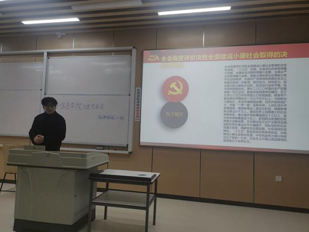 11月27日,为响应国家的号召,加强学院学生的思想教育,电子信息学院2019级专职辅导员吴秀玲、兼职辅导员冯娟娟组织2019级本科生举行了十九届五中全会精神分享会,本次分享会在综合楼C座405举行,从下午15:40进行至16:40。
