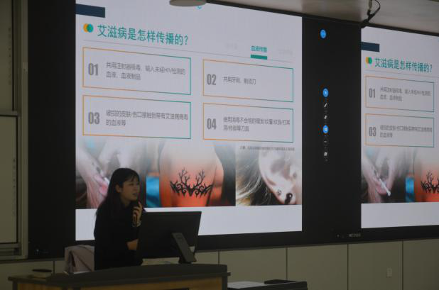 首先,朱婧对于近期的新冠肺炎疫情做出了相关的说明,指导同学们如何防范病毒传播,做到科学防疫,安心学习与生活。随后,朱婧开始了关于艾滋病防治的宣讲。在宣讲的过程中,朱婧播放了两个视频,以生动形象的方式告诉了同学们什么是艾滋病、艾滋病的起源、临床症状和传播途径,让同学们深刻地了解了艾滋病的危害。朱婧还强调近年来在我国15岁到24岁的青少年中大学生感染艾滋病的情况越来越严峻,迫切需要遏制艾滋病在青少年中的传播。她向同学们科普了有效防治艾滋病的具体措施以及暴露于艾滋病高感染风险后的紧急自救方法-服用PEP暴露后阻断药物。提倡同学们正确地科学地看待我们身边的艾滋病患者,做到不歧视。最后朱婧强调从青少年起,树立健康的恋爱、婚姻、家庭及性观念是预防和控制艾滋病传播的治本之策。