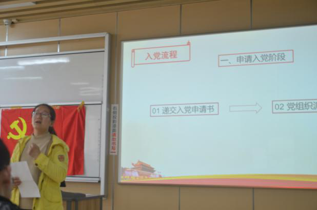 在对入党的规范流程的讲解中,吴秀玲老师先向各位同学介绍了入党的具体流程,让大家对入党的流程有了清晰的了解。然后,她又向大家介绍了入党材料的格式规范,如入党申请书和思想汇报的规范格式和一些应该注意的问题,以避免大家在上交入党材料时出现不必要的错误,浪费不必要的时间。会议最后,吴秀玲老师介绍了本学期入党交流安排并对入党积极分子进行了任务安排,让他们能够做出一个合理的入党规划,为顺利入党奠定坚实的基础。