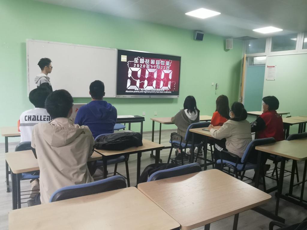 随后主持人引出了作为新时代长征路之一的扶贫攻坚。在观看了解中国扶贫攻坚开创的空前壮举后,支持人带领大家了解了扶贫成就后的奠基人——扶贫干部的感人事迹,引发同学讨论并亲身感悟在脱贫攻坚伟大斗争中锻造形成的“上下同心、尽锐出战、精准务实、开拓创新、攻坚克难、不负人民”的脱贫攻坚精神。
