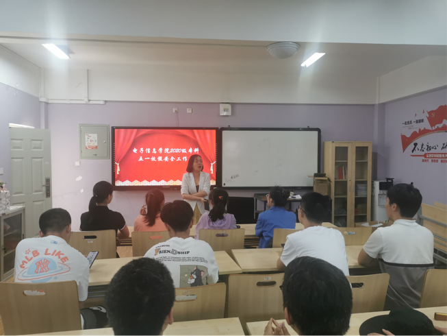 五一假期临近,在放松娱乐和巩固知识之余,最重要的便是安全问题。安全是一切活动的基础与前提,对于学生来说更是如此。本着对每一个学生的安全负责的态度,电子信息学院组织2020级各班班长、团支书于2021年4月30日中午12:30开展了五一放假安全工作会,电子信息学院2020级辅导员陈晓娟老师主持会议。
