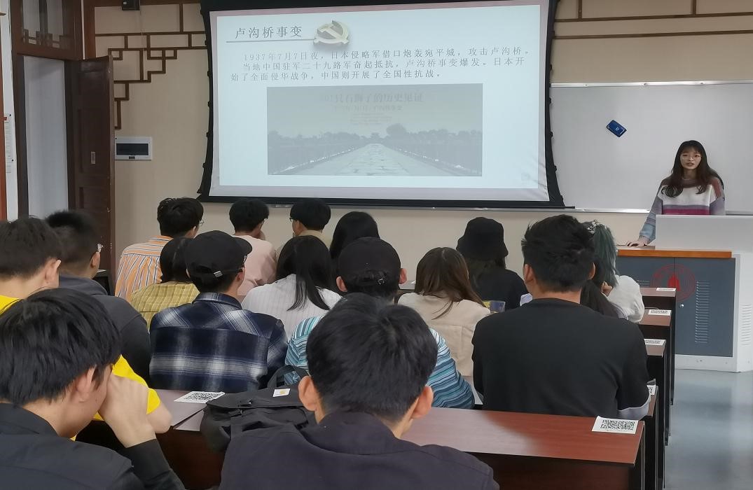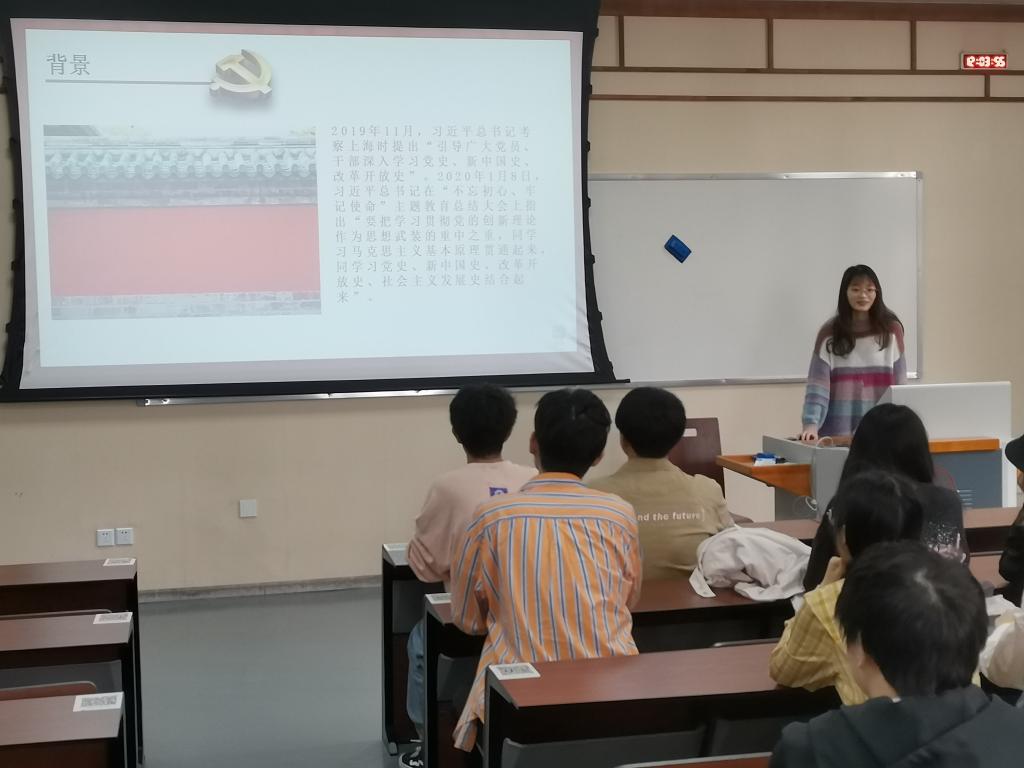 会上,首先由主持人胡佳佳同学以PPT的形式向同学们详细的介绍了“四史”中党史的介绍和背景,使同学们对党的发展历程有了基本的了解,并引导同学们把幸福感内化为对党和社会主义祖国的热爱和忠诚。