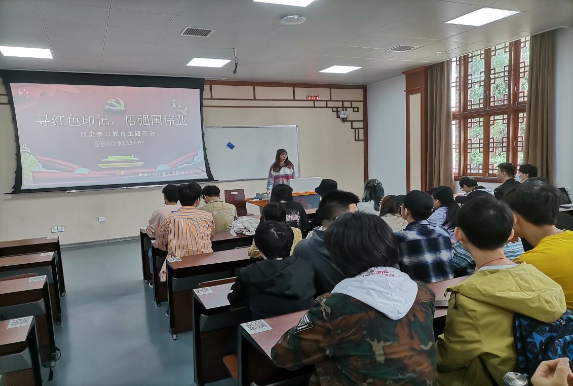 4月25日上午,由团支书胡佳佳同学带领2018级电子信息工程一班全班共47人,在二教B206参加“寻红色印记,悟强国伟业”四史学习教育专题班会,参与讲授改革开放史,以党建带领团建,开展青年团员社会主义核心价值观教育,引领青年团员知史爱党。
