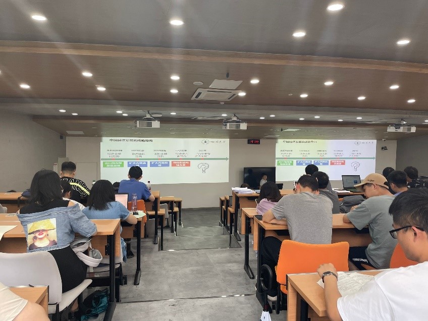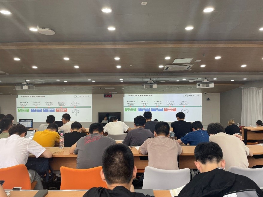 本次课程将由学生继续进行汇报。其中一组同学汇报令人印象尤为深刻。其汇报主题为《中国经济的战略导向》。习近平总书记在省部级主要领导干部学习贯彻党的十九届五中全会精神专题研讨班开班式上指出“要坚持理论和实际、历史和现实、国内和国际相结合”,明确了“十四五”时期经济社会发展的战略导向。该同学从改革开放时期到目前的经济环境进行了介绍,并阐述了各个时期的经济战略,如改革开放时期采用出口导向型发展战略,十八大以来经济进入“新常态”时期,我国实施供给侧结构性改革的经济发展战略。