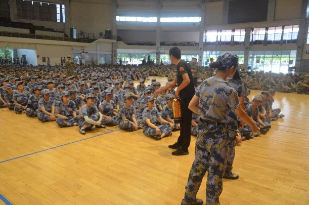 军训第四天,2021年7月10日上午8点江安体育馆,电子信息学院2019、2020级全体军训学生参加消防安全演练活动。