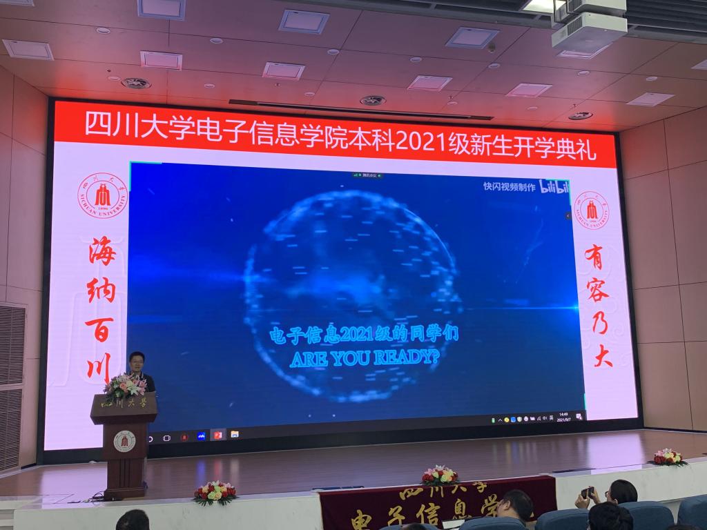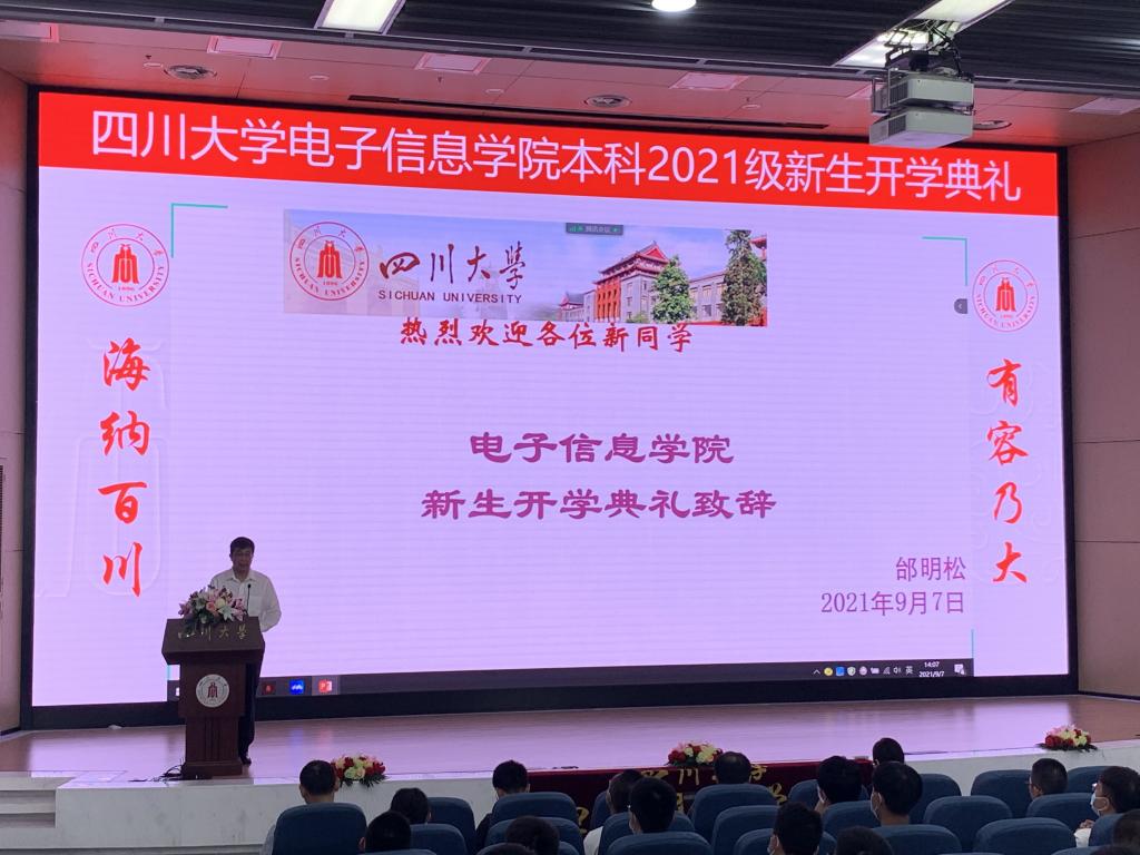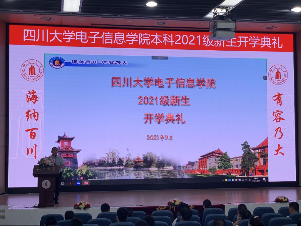 2021年9月7日下午两点,由电子信息学院党委副书记陈笃海主持的电子信息学院2021级本科新生开学典礼在江安校区水上报告厅顺利进行。学院党委书记邰明松、院长冯国英、党委副书记陈笃海、副院长雷印杰、教师代表卿粼波、2021级辅导员孟滋常、朱婧老师和2020级辅导员陈晓娟老师出席了本次大会。