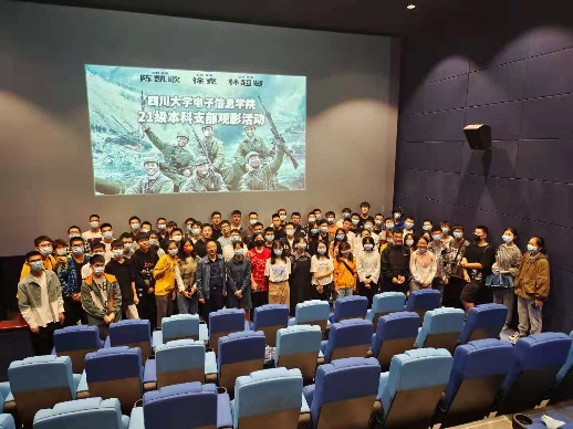 为缅怀先烈功绩,弘扬爱国主义精神,2021年10月6日上午10时至下午1时,电子信息学院21级学生开展了爱国红色观影活动,影片名称为《长津湖》,2021级辅导员孟滋常老师,2021级兼职辅导员孔洁老师出席了此次活动。